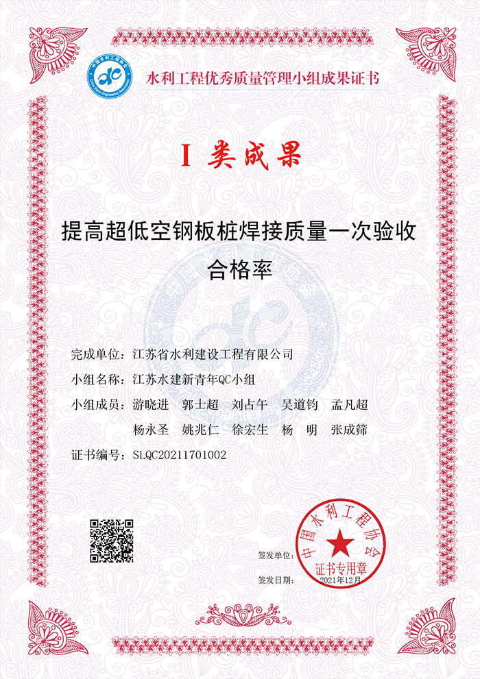 1127 日,中国水利工程协会公布了2021年度水利工程优秀质量管理小组成果,世俱杯网页版登录入口参加发布的5QC课题获评优秀质量管理成果奖,其中I类成果1项,II类成果4项。第三工程分世俱杯网页版登录入口江苏水建新青年QC小组现场型QC成果《提高超低空钢板桩焊接质量一次验收合格率》荣获I类成果。