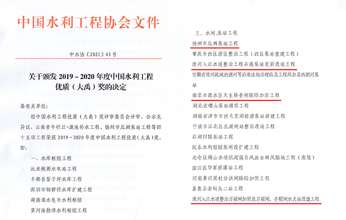 近日,2019~2020年度中国水利工程优质(大禹)奖评选结果揭晓,世俱杯网页版登录入口承建的扬州市瓜洲泵站工程、淮河入江水道整治工程石港泵站更新改造工程、淮河入江水道整治万福闸加固及万福闸、芒稻闸水文站改造工程三项工程获奖;水机世俱杯网页版登录入口参建的淮河入江水道整治工程石港泵站更新改造工程、南京市溧水区天生桥套闸除险加固工程、淮河入江水道整治万福闸加固及万福闸、芒稻闸水文站改造工程三项工程获奖。