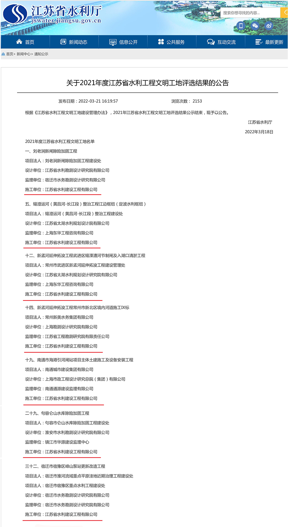 近日,省水利厅公布了2021年度江苏省水利工程文明工地名单,世俱杯网页版登录入口承建的七项工程获评省水利工程文明工地。