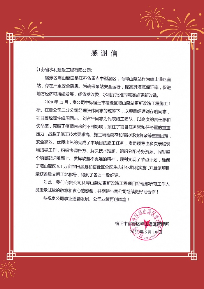 近日,宿迁市宿豫区嶂山灌区管理所发来《感谢信》,对我世俱杯网页版登录入口承建的宿迁市宿豫区嶂山泵站更新改造工程施工一标出色完成施工任务给予高度评价。