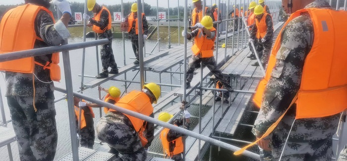 6月20日,世俱杯网页版登录入口参加全省军地联合防汛应急抢险救援培训演练队员们顶着炎炎烈日投入训练,他们挥汗如雨,在省防汛抢险训练场(南京市六合区红山窑水利枢纽)严格按照演练要求进行钢木组合土石坝钢木框架的搭、拆培训。