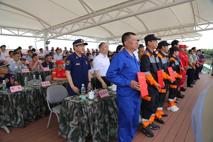 在接着举行的2022年全省军地联合防汛应急抢险演练大会上,与会领导为各个省级专业骨干队伍颁授命名证书。