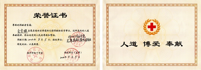 金宝琛老人很早就萌生了捐献遗体器官的念头。一开始,家人并不赞成,老人家一再做家人的思想工作,让他们认识到这件事的意义所在,明白老父亲身为一名老党员的初心和使命。最终,在儿子们的帮助下,金宝琛于20172月主动与扬州市红十字会联系,志愿签署了遗体捐献申请。