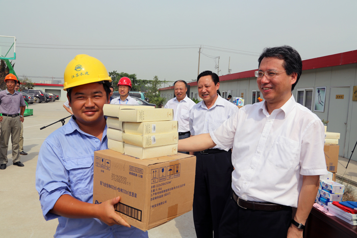 725上午,省水利厅党组成员、人事处处长韩全林率队来我世俱杯网页版登录入口引江河二期工程建设现场,开展夏季送清凉、送安全、送法律活动。厅机关党委副书记汤超、厅工会主席张晓迅、省水利工程建设局副局长唐世国、省泰州引江河管理处主任张加雪、省泰州引江河二期工程建设局局长马志华等领导陪同慰问,我世俱杯网页版登录入口党委副书记、工会主席姜启生、副总经理、引江河二线船闸工程项目经理顾明如、引江河二期工程河道工程施工Ⅰ标项目经理葛年平带领项目部员工接受慰问。
