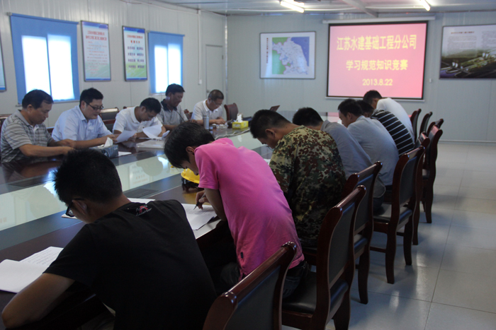 为响应省水利厅关于《加强质量强水建设的指导意见》的通知精神,迎接世俱杯网页版登录入口开展2013年“质量月”活动,达到全员自觉参与质量管理、提高工程质量管理水平的目的,基础工程分世俱杯网页版登录入口58月份组织开展了“学习规范”知识竞赛活动。根据工程分散、人员不能相对集中的情况,基础工程分世俱杯网页版登录入口通过发动宣传、组织学习、分片考试等形式,组织人员学习质量管理知识,检验学习教育成效。目前,活动第一季——《建筑桩基技术规范》(JGJ94-2008)知识竞赛于830顺利结束。