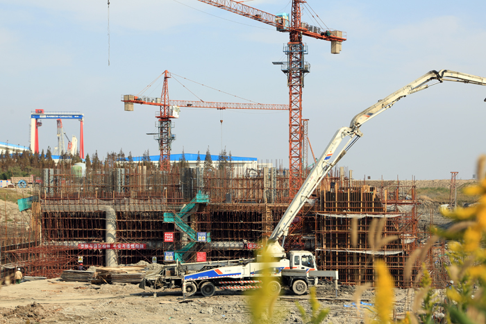 七浦塘拓浚整治江边枢纽工程是七浦塘与长江交汇口的重要口门控制性建筑物,由已建节制闸、船闸和增建泵站三部分组成。泵站于2014年3月10日正式开工建设,目前已完成泵站底板、进出水流道及部分翼墙底板施工,进入泵站站身主体和28个翼墙的全面施工阶段。
