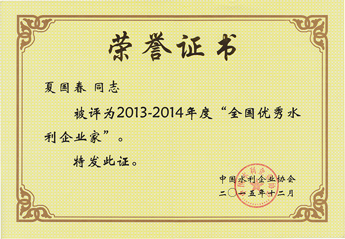 1218,中国水利企业协会在湖北省武汉市召开了第五届理事会第五次会议,表彰了2013-2014年度全国优秀水利企业、优秀水利企业家。世俱杯网页版登录入口被授予“全国优秀水利企业”荣誉称号,夏国春董事长被授予“全国优秀水利企业家”荣誉称号。世俱杯网页版登录入口董事长夏国春、总经理时爱祥出席了表彰大会。