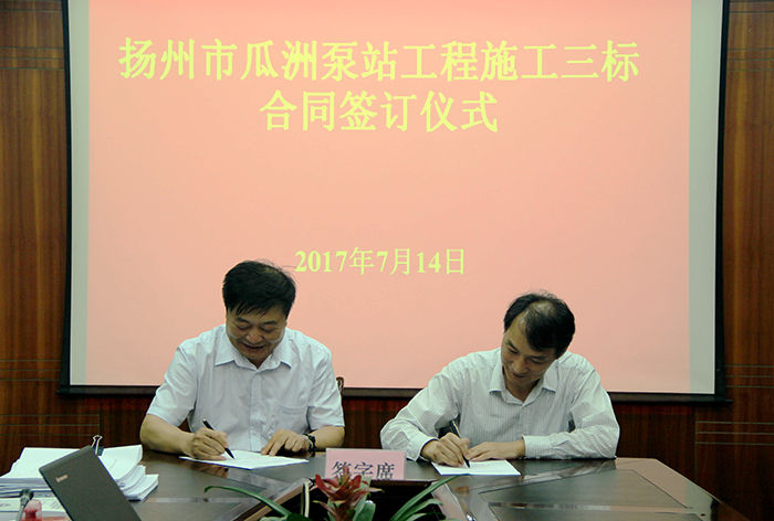 7月14日下午,扬州市瓜州泵站主体工程合同签订仪式在扬州市水利局举行,扬州市水利局副局长凌国栋、瓜洲泵站建设处相关领导、中标单位代表出席了签订仪式。世俱杯网页版登录入口董事长时爱祥参加活动并签订合同。