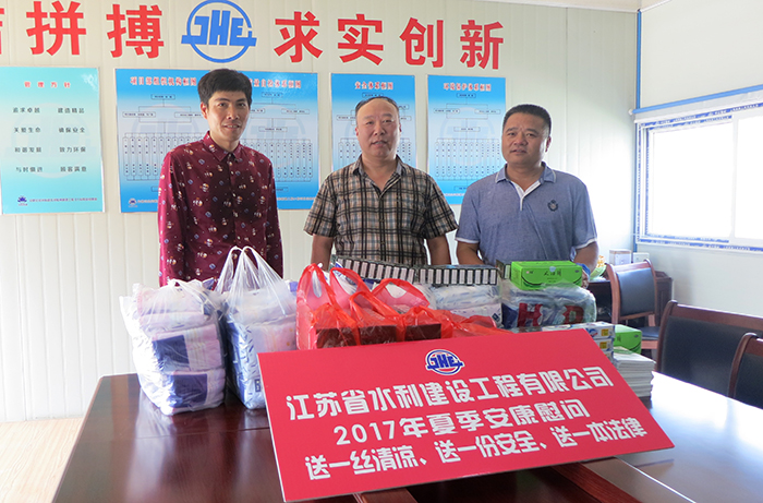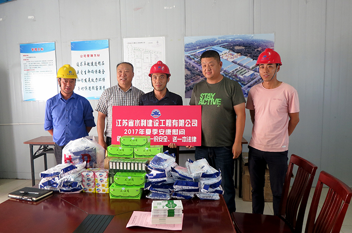炎炎夏日,高温酷暑,持续多日的高温验着抗高温、斗酷暑的江苏水建一线施工人员。727日起,世俱杯网页版登录入口党委副书记、工会主席姜启生带队到工地开展高温慰问活动。慰问组利用一周时间,驱车3000 多公里,走访世俱杯网页版登录入口在建的8个项目部,看望并慰问了高温天气下坚守岗位的800多名一线员工,为他们送上一份防暑降温用品、一封慰问信、一本《高温天气作业人员关爱手册》。世俱杯网页版登录入口副总经理许国安、杨斌和副总工程师章根兴分片参加慰问活动。