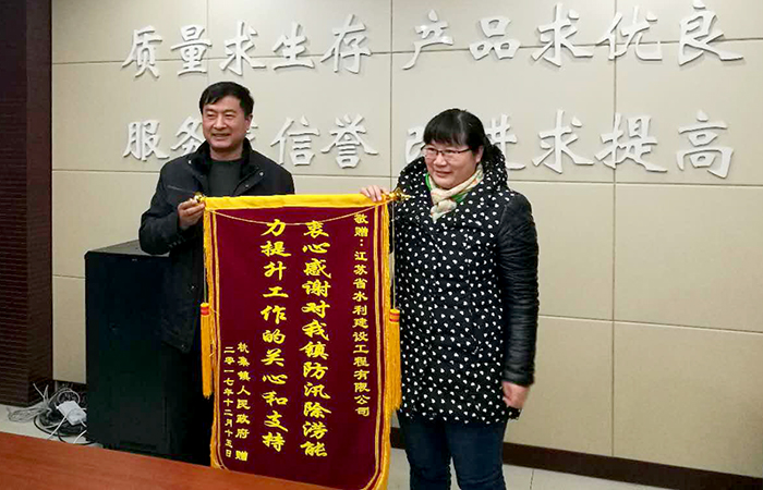 1215日,2017年广陵区农田水利重点县工程Ⅱ标通过了完工验收。验收会上,杭集水利站王站长代表杭集镇人民政府授予我单位锦旗,衷心感谢世俱杯网页版登录入口在农水重点县工程上作出的贡献,以及对杭集防汛除涝能力提升工作的关心与支持。