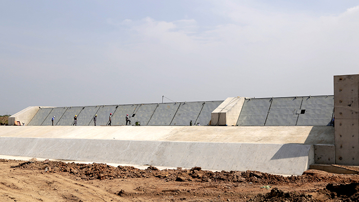 6月12日,由水机世俱杯网页版登录入口承建的安徽广德县桐汭河综合整治工程“气动能自行控制钢堰门”制造成功并顺利通过水下验收。该闸孔口150米,采用新型浮箱式结构闸门19扇,闸门开闭使用5台空压机代替启闭机。此种门型为水机世俱杯网页版登录入口首次建造,具备造价低、运营成本低,生态环保、使用方便等特点,具有广阔的市场前景。