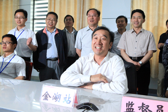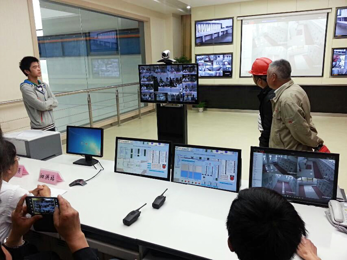 国调办李鹏程司长在金湖站主控室内与泗洪站视频对话