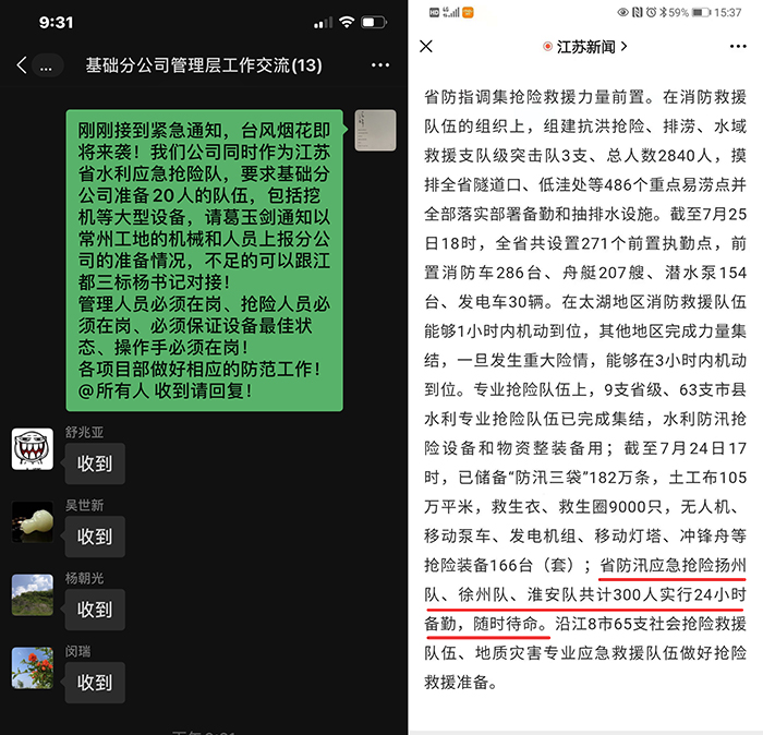 23日晚8时,世俱杯网页版登录入口接到省应急管理厅要求防汛抢险队伍集结待命的通知。世俱杯网页版登录入口综合管理部门立即汇报总指挥,在应急抢险队工作群内发布集结信息。苏南片区各分世俱杯网页版登录入口在建项目部立即行动起来,纷纷报名请战。