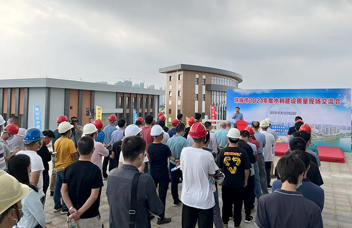 10月29日下午,珠海市2021年度水利建设质量现场交流会在我世俱杯网页版登录入口承建的珠海市斗门区白蕉联围排涝整治工程白藤泵站项目部开展。活动由珠海市水务局主办,珠海市各区水行政主管部门、市水务工程质量安全管理中心、市水务协会以及在建水利工程参建单位近100名代表参加了交流会。