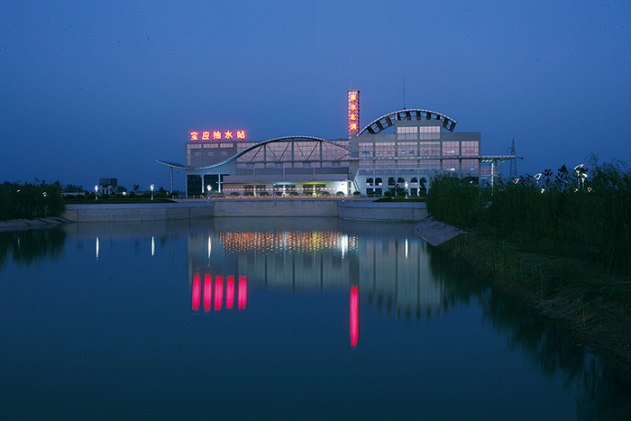 南水北调东线一期工程宝应站是我国南水北调工程第一批开工、第一个建成、第一个发挥效益的大型泵站工程,与江都水利枢纽共同组成第一梯级抽江泵站,实现抽引江水500 m3/s的目标。