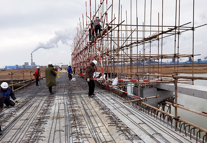 2月8日,新沂河海口枢纽南、北深泓闸除险加固工程项目寒风刺骨,项目部管理人员、木工队、钢筋队、水石队50余人全部进场,投入紧张有序的施工。项目已完成工作便桥吊装、闸门的吊装转运、交通桥桥面铺装层钢筋绑扎、排架施工脚手架搭设、工作桥预制钢筋绑扎及立模等。