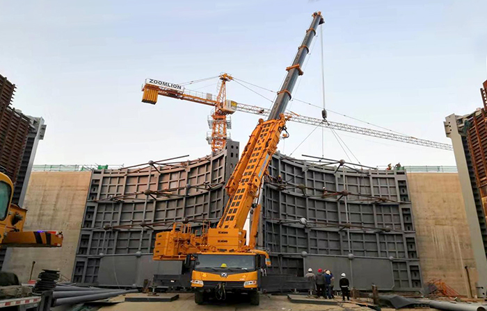 3月3日,在两台大型起重吊机的配合下,安徽裕溪一线船闸扩容改造工程下闸首闸门第一片分段成功起吊就位,标志着世界最大孔口宽(34m)的船闸三角闸门正式进入安装阶段。