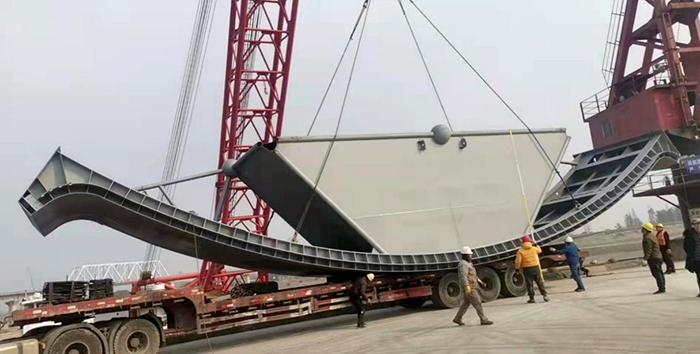 合裕线裕溪一线船闸扩容改造工程金属结构制造及安装工程由水机世俱杯网页版登录入口在安徽片区中标承建,工程位于安徽省合裕线航道入长江3km处,正向最大设计水头4.98m,反向最大设计水头-3.80m,闸门采用可承受双向水头动水启闭的三角闸门形式,口门宽34m,是目前在建世界最大口宽的船闸三角闸门。其中,上游闸门高度13.73m,重达216.6t,下游闸门高度16.62m,重达244.9t,门叶最大分段超过50t。当前国内外船闸采用三角闸门的口宽多为23m,34m口宽的三角门在船闸应用尚属首例。