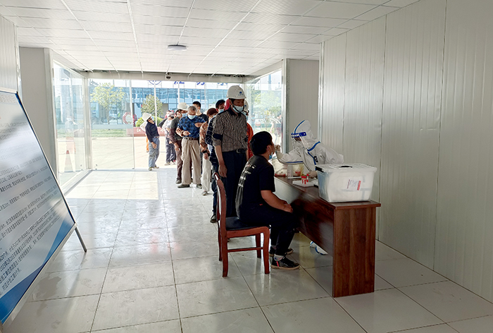 项目部按照当地卫健部门和社区的要求设置了隔离区,备足口罩、84消毒液等防疫物资,规范完成生活区、施工现场的通风消毒工作,并设置了防疫物资专用回收箱。为减少员工和外界接触,项目部联合当地医疗机构在生活区设置核酸检测点,做到每天一检,确保所有员工应检尽检。