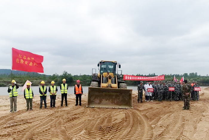 演练模拟太湖县辖区内持续暴雨,当地花亭湖水库为缓解压力开闸泄洪,长河水位上升超警戒水位,项目部施工段堤防出现管涌险情,严重危及周边村民的生命财产安全。新仓镇防指立即启动应急预案,联系各部门奔赴险情处开展抢险救援,镇基干民兵排和项目部防汛抢险突击队立即组织人员装运沙袋,配合现场施工机械对河堤管涌险情进行处置,卫生组、后勤组做好保障工作。经过参演人员的共同努力,成功处置管涌险情,圆满完成防汛演练任务。