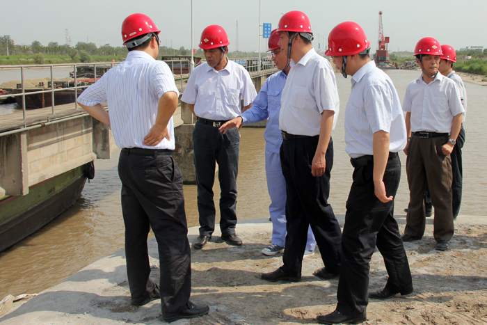 李陆玖一行实地查看了工程建设现场,重点检查了二线船闸度汛准备及上、下游施工围堰,听取了马志华局长、顾明如副总经理对工程建设、施工情况的汇报。李陆玖组长指出,泰州引江河第二期工程是全省关注度较高的重点水利工程,参建各方要精心组织、落实措施、确保安全。一要加强安全管理。要落实安全措施,保证工程安全、生产安全、资金安全和人员安全。二要确保安全度汛。针对长江流域的防汛特点,以及可能遭遇的台风情况,思想上高度警惕,组织上落实到位,积极做好各项应对预防措施。三要强化廉政建设。通过加强教育、建立一整套规范制度等各项措施,切实加强重点工程的廉政建设,营造清正廉洁的良好氛围。四要深入推进政风行风建设,贯彻落实全省水利系统开展“四位一体”评议政风行风创新行动的相关要求。重点水利工程是水利行业面向基层百姓的一扇窗口。在工程建设中,特别是在涉及到老百姓切身利益的征地拆迁中,要以人为本,妥善处理,充分展现水利行业良好形象。