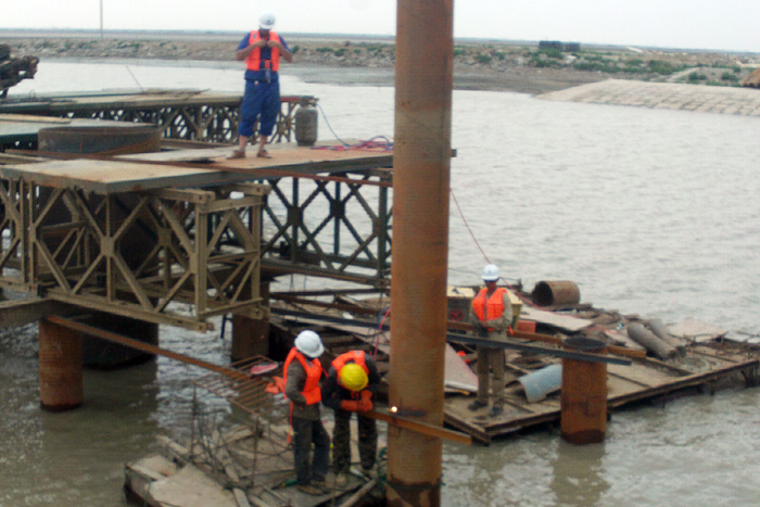 我世俱杯网页版登录入口承建的新城闸交通桥工程是连云港市海滨大道工程的重要组织部分,位于市区段西北端,我世俱杯网页版登录入口新建的新城闸上游侧。跨径180m,单孔跨度30m,桥宽26m。上部结构为预应力混凝土组合箱梁,下部结构为桩柱式墩台,钻孔灌注桩基础。按照连云港市政府关于加快推进2013年“一号工程”海滨大道建设的工作要求,新城闸交通桥必须保证今年贯通,施工工期紧,任务相当繁重。工程开工时已临近汛期。为保证安全度汛,项目部采用搭设钢便桥和水上施工平台的方案取代传统的围堰截流方式,进行水下灌注桩施工。目前东岸钢便桥已基本完成,4#桥墩桩基钢护筒已经就位,钻机平台正在加固。