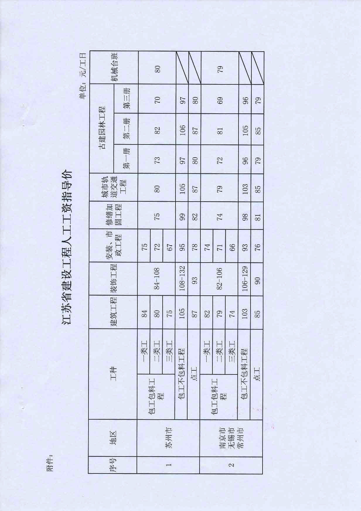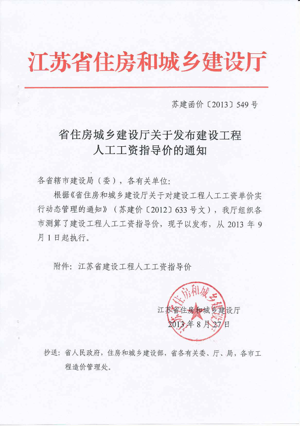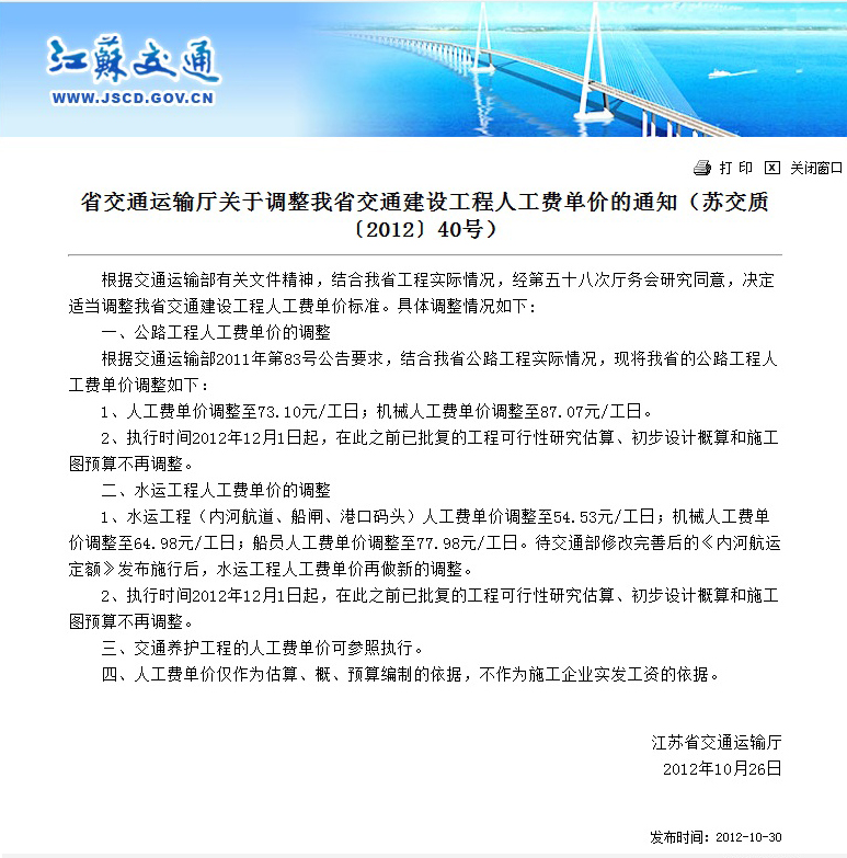 2013年8月27住房城乡建设江苏建设工程工资指导函[2013]549号);20121026,省交通运输厅发布了《关于调整交通建设工程人工费单价的通知》(苏交质[2012]40号)。现转载上述两个文件,供大家工作参考。