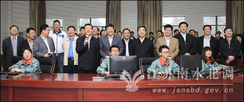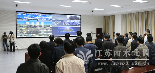 与会代表在南水北调工程应急调度中心了解了各个泵站准备情况,试运行开始后查看了南水北调江都四站工程运行情况。
