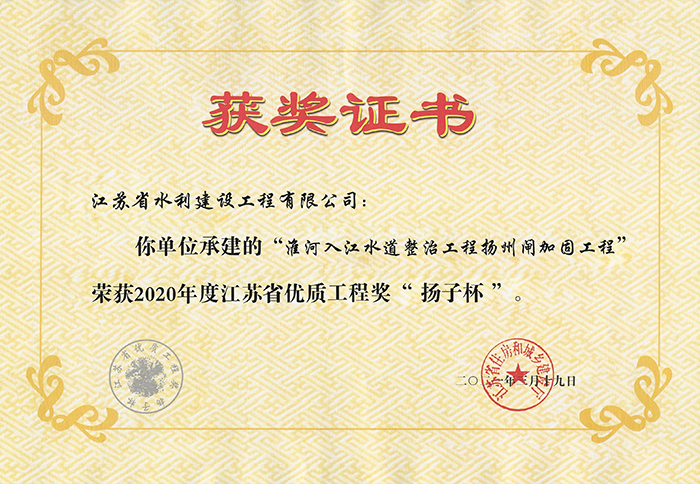 淮河入江水道整治工程扬州闸加固工程获2020年度江苏省优质工程奖“扬子杯”