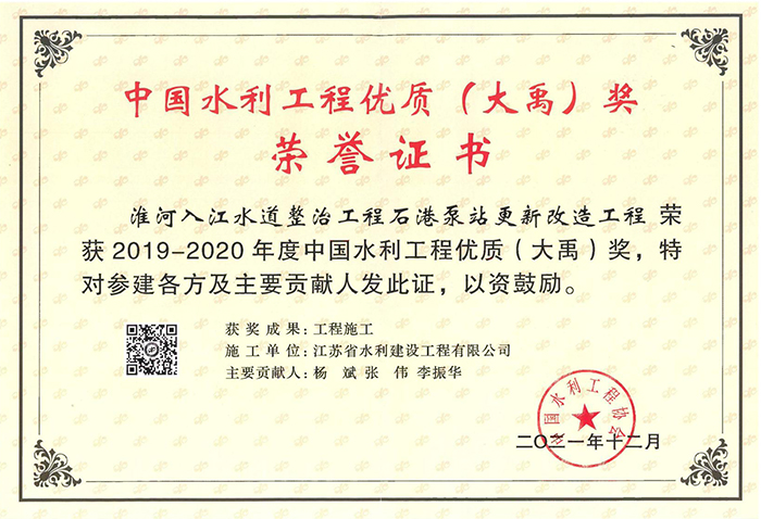 2019-2020中国水利工程优质(大禹)奖(扬州市瓜洲泵站工程)