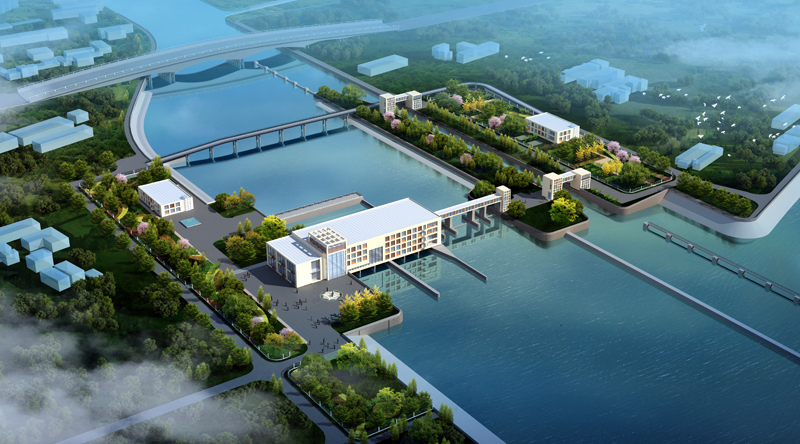 新沟河延伸拓浚江边枢纽工程是新沟河与长江交汇口的控制性建筑物,位于无锡江阴市申港镇滨江村新沟河入江口,由节制闸、泵站、船闸和鱼道四部分组成,节制闸为中型拦河、挡潮水闸,共5孔总净宽48m。泵站为大II型泵站,装立式轴流泵组6台(单向排水和双向引排各3台),正向排涝(排水)规模为180m3/s,反向引水规模为90m3/s。船闸级别为Ⅴ级,通航净宽18米。鱼道规模为2m(宽)×55m(长)。工程建成后将具有引水改善水环境、挡潮、防洪、排涝、航运及过鱼等综合功能。