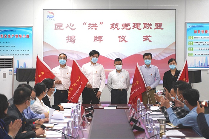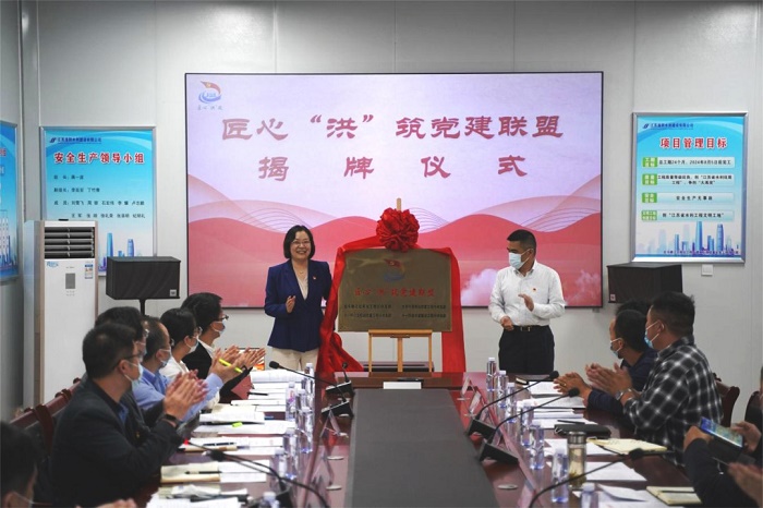 10月25日,张家港市水务局“匠心洪筑”党建联盟揭牌,十一圩江边枢纽改建工程项目行动支部正式成立。