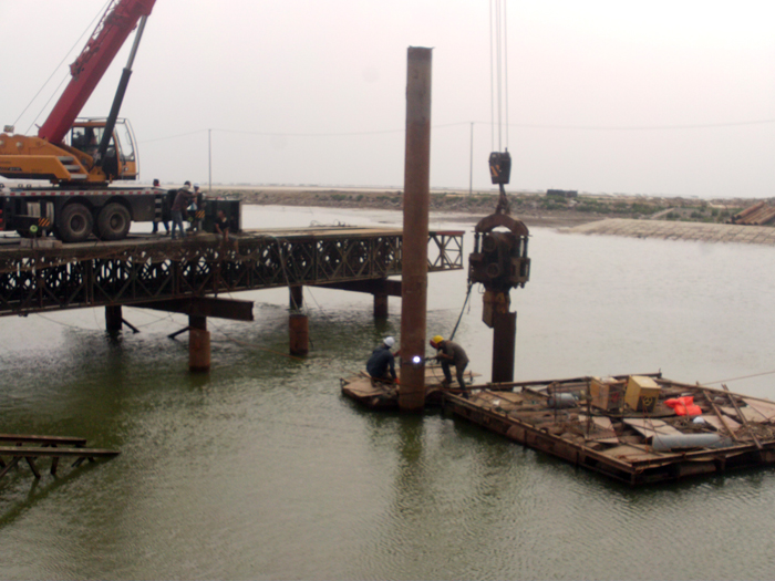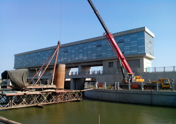 而全桥3640多米深的钻孔灌注桩施工因其地质复杂多变、未知因素多,成为施工第一难点和焦点,尤其是地处河道深水区的12个桥墩的灌注桩施工更是异常艰难。同时新城闸还是连云新城地区唯一能在汛期发挥城市防汛排涝的水闸,汛期必须保证正常运行。项目部根据施工现场地质条件,经过多个方案比选,最终采用了搭建水上平台施工方案,在河道上搭设钢便桥进行钻孔,保证新城闸在汛期也能正常运行。由于地质条件复杂多变,再加上特殊的施工环境造成的护筒内外的特殊压力差,因此,必须抓好施工过程控制,及时处理特殊事件,以确保工程顺利进行。当进行到最后一个桥墩灌注桩作业时,成孔作业在水下30多米深发生了塌孔现象,锤头被埋在下面。尽管项目部想尽了办法,也没能捞出锤头。但时间不等人,项目部当机立断,放弃锤头打捞,重新购置了一只价值6万多的锤头继续作业。917,完成了全部灌注桩施工任务,为开展交通桥主体施工扫除了第一道障碍,也为我世俱杯网页版登录入口在沼泽、淤泥湿地中钻孔成桩积累了经验。