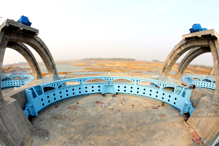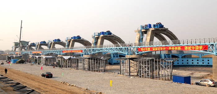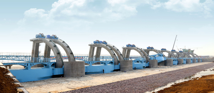 416日,由江苏省水利机械制造有限世俱杯网页版登录入口承建的亚洲最大的水利拦河闸坝工程——青岛市大沽河水资源开发利用工程通过水下验收。该项目是青岛治河史上规模最大、周期最长、档次最高的综合性基础建设项目,总投资额1.2亿元,金属结构共3000吨,5600万元,包括925M×3.5M护镜式钢闸门及9台套2×1250KN盘香式卷扬启闭机,闸门顶部设置人行桥;下游侧配套9座人行钢桥。该拦河闸坝工程被誉为亚洲第一坝。