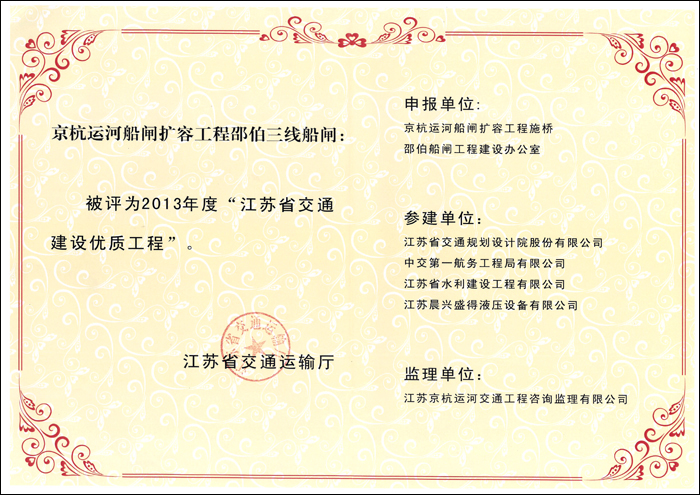 本站讯,近日,由我世俱杯网页版登录入口参建的京杭运河扩容工程邵伯三线船闸工程被江苏省交通运输厅评为“2013年度江苏省交通建设优质工程”。