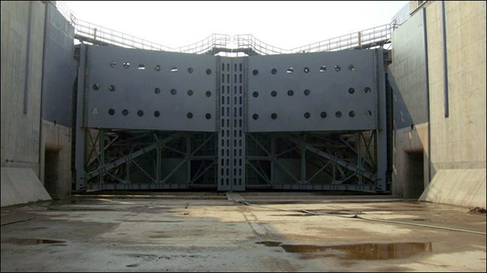 邵伯三线船闸为II级船闸,设计最大船舶等级为2000吨级,船闸尺度为23 m×260 m×5m。上、下闸首各设三角闸门两扇,对称于船闸中心线,面板朝向引航道侧。其中,上闸首闸门高度为8.82m(面板高度),重约107t;下闸首闸门高度为11.22(面板高度),重约122.5t。阀门采用钢质提升平板门型,上、下闸首各设两扇。