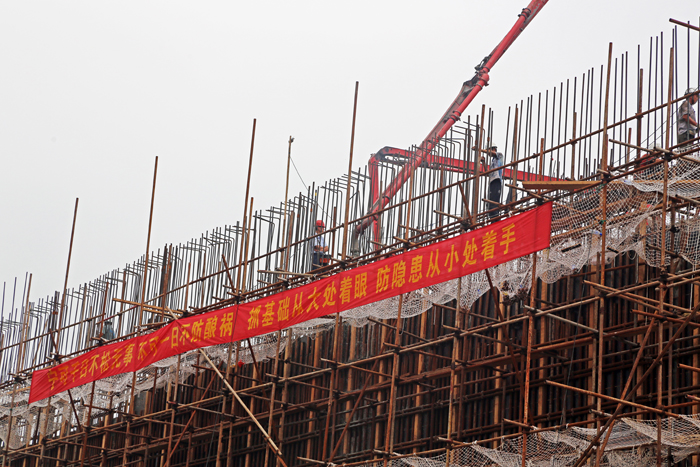 继第一节沉井实施完成后,项目部立即进入了紧张的第二节制作施工。项目部精心组织,科学管理,带领全体员工顶住烈日和暴风雨的考验,迅速开展第二节沉井脚手架、模板和钢筋作业,确保如期具备大浇筑条件。