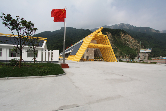 完工后的枢纽格外雄伟壮观,我们把废墟中那三面特别的旗帜,永久地矗立在新的广场上。当人们走过绵竹汉旺地震遗址纪念地来到这里,一幅蓝天白云、青山绿水与工程和谐相处的画面,与遗址印象产生强烈反差,形成视觉上的冲击与心灵上的震撼。风雨过后,这里的旗帜分外艳丽!