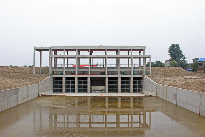 迎春河闸站是扬州市归江河道以西区域廖家沟西堤上的穿堤建筑物(原名为霍桥套闸),与迎春河相接,地处北洲大圩北片区。主要建设内容为翻扩建迎春河闸站,采用一字式布置,中间布置1孔5m宽节制闸,两侧各布置3台立式轴流泵,设计抽排流量15.0m³/s,自排流量26.3m³/s。