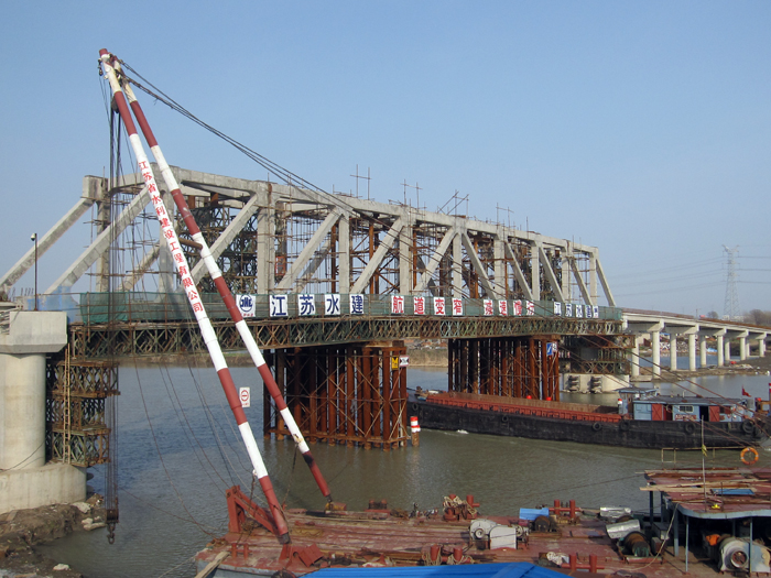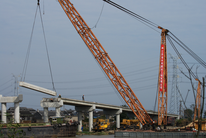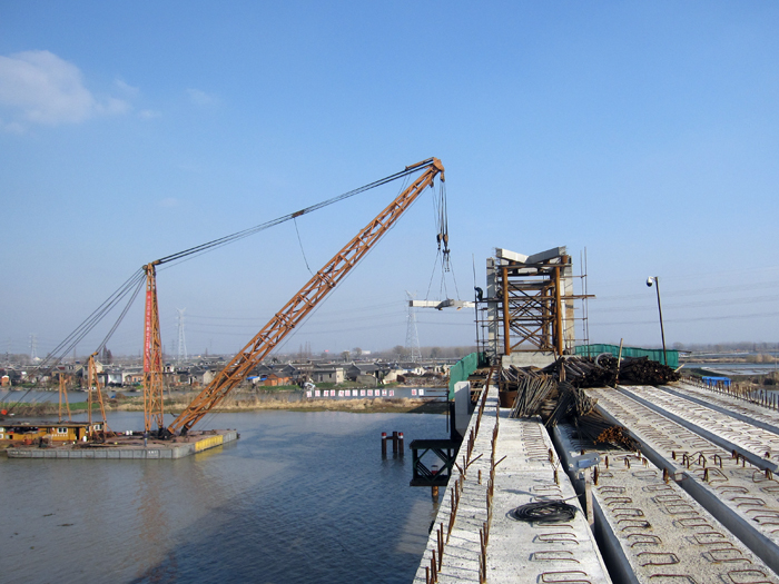 董潭生产桥是南水北调泰州市卤汀河拓浚跨河桥梁工程两座中的其中之一,全长348.3米,接线长707.021米,主跨为85米桁架梁,两侧引桥为13孔20米的先张预应力空心板梁。