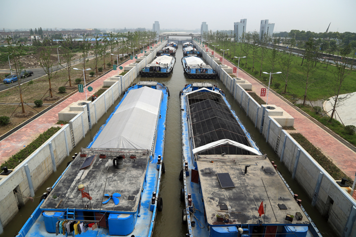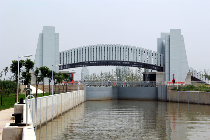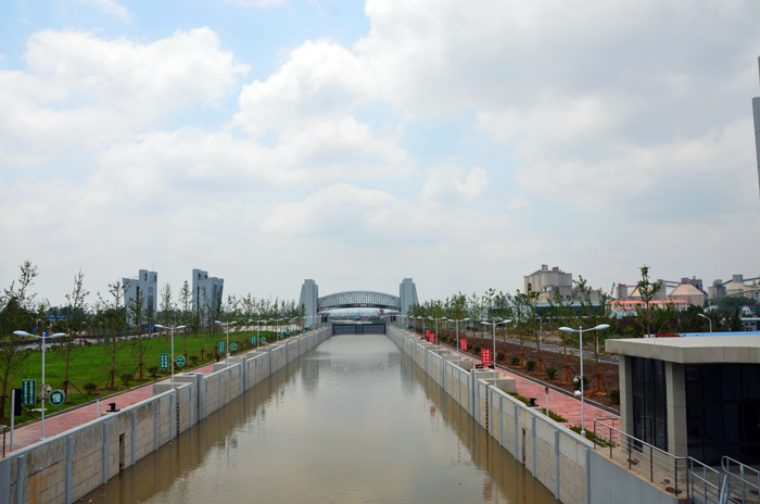 泰州引江河二线船闸距长江边1300m,位于一线船闸西侧,船闸规模为230 m×23 m×4m(长×宽×槛上水深),于2012年12月18日开工建设,2014年6月10通过水下阶段验收,现已完成主体工程、附属设施等投入使用验收的全部建设任务,已具备运行管理条件。