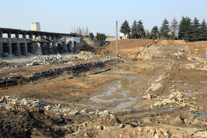 下午,世俱杯网页版登录入口朱学林董事长、建设处丁淮波主任、监理处王国强总监等一行,在驻守该工程的常务副总经理时爱祥、项目经理李新海的陪同下,仔细察看了工程现场,慰问了正在上班的一线工人,并召开了一个简短的碰头会,就工地目前存在的情况交换了意见。自114日项目先遣人员到工地现场以来,20多天时间已完成闸塘抽水,开始老闸拆除和基坑降排水,并利用一组废旧的化工厂厂房,建起了临时生活和办公用房。在项目部的春节生产计划中,一个“急”字让这个春节抢工变得格外的沉重——原本采取降水措施后即开始机械开挖基坑,因地下水极为丰富,不得不暂时中断施工,等待具备条件才能进行土方开挖。而这又使本已极为紧迫的工期比原节点计划滞后10多天。春节前项目部邀请世俱杯网页版登录入口多位专家反复商量,苦思良策。针对这种情况,项目部将“慢性病”当作“急病”医,始终立足一个“抢”字:正月初二继续在围绕基坑一圈的轻型井点内侧再施打一圈轻型井点;正月初四开始冲土作业,降水与水力冲土双管齐下,咬定目标,抢抓时间,加班加点,全力推进,一点点地破解难题。