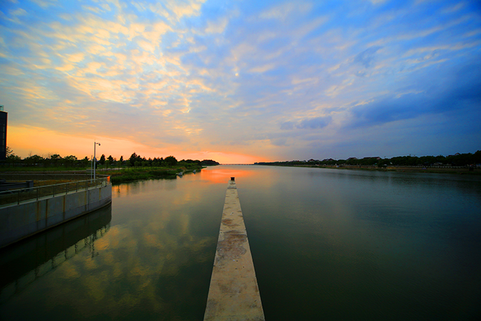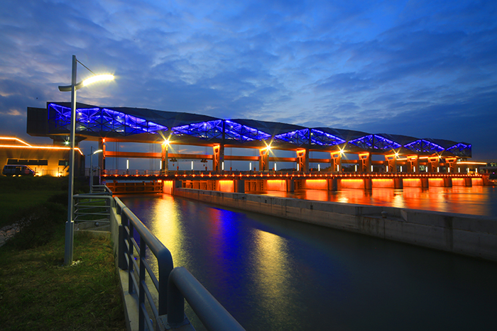 2014年初秋,工程建成通过完工验收。新建的太浦闸面貌焕然一新,建筑新颖,气势恢宏。而当华灯初上,夕阳西下之时,节制闸的景观灯全部亮起。幽幽的蓝光沿着启闭机房波浪型的立面上来回流动,灯亮时闸身飘逸灵动,玲珑剔透;灯暗时沉稳厚重,幽静天然。动与静的结合,时间与空间的转换,使太浦闸宛如苍龙腾飞,傲立于浦江源上。此时,水是永恒的蓝,闸则色彩绚烂;闸因水而巍峨,水因闸而秀美。巍峨壮美的水利工程,绚烂秀丽的太浦河夜色,浑然一体的浦江源景致,让人水和谐的现代水利文明大放光彩。