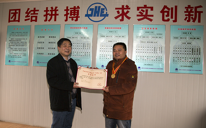 时爱祥总经理向项目经理崔超颁发2015~2016年大禹奖获奖证书