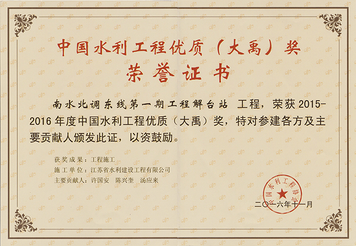 中国水利工程优质(大禹)奖由中国水利工程协会组织评选,奖励以工程质量为主,兼顾工程建设管理、工程效益和社会影响等因素的优秀工程。