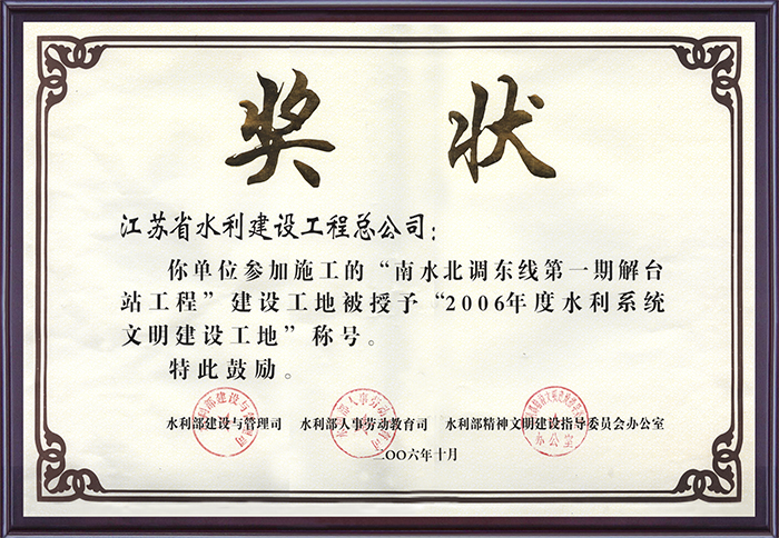 施工过程中,项目部坚持精神文明和生态文明并重,成立了精神文明建设领导小组,积极开展企业文化、廉政文化、历史文化进工地活动,用文化改变粗犷的施工行为,用文化提升浑朴的工作作风,用文化开放创新的科研风气。该工程先后被评为江苏省南水北调文明工地江苏省水利建设文明工地全国水利系统文明工地