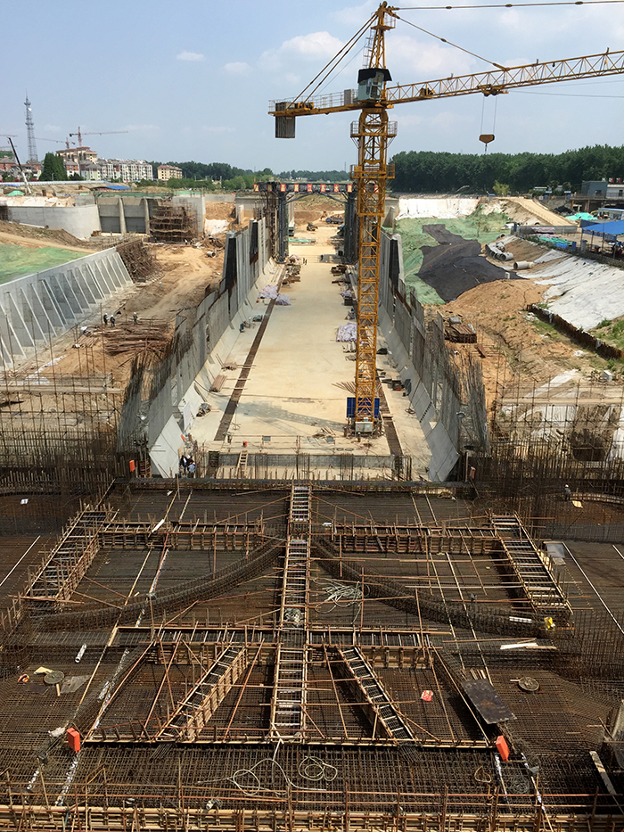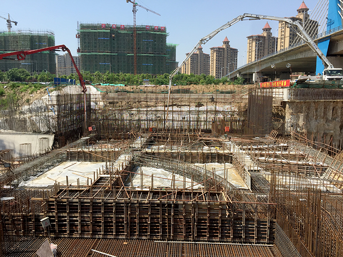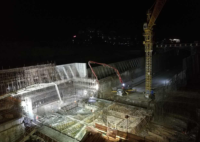 浍河航道五河新建船闸工程上闸首底板平面尺寸55×31.3 m,顶高程9.37,底高程2.874.37,钢筋制安600t,混凝土6200 m3。钢筋、模板制安于510日完成并通过验收。项目部克服混凝土原材料采购异常困难等不利因素,于525日将浇筑材料组织到位,开仓浇筑。经过6个昼夜的连续奋战,顺利完成了上闸首底板混凝土浇筑任务,为该工程2017年底主体工程顺利完工奠定了坚实的基础。此次浇筑也是世俱杯网页版登录入口历史上单体最大的一次混凝土浇筑。