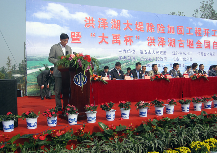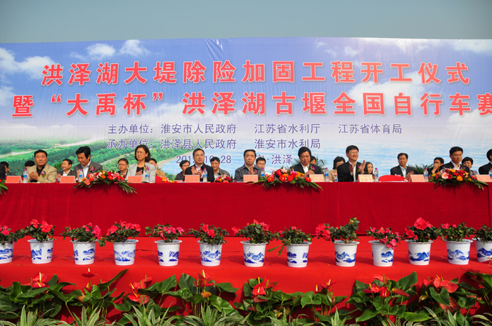 10月28日上午,洪泽湖大堤除险加固工程开工仪式在风景如画的洪泽湖畔隆重举行。水利部淮河水利委员会副主任刘玉年出席仪式并致辞,省水利厅厅长吕振霖、副厅长李亚平及淮安市委等领导出席了开工典礼。我世俱杯网页版登录入口董事长朱学林在仪式上发言。