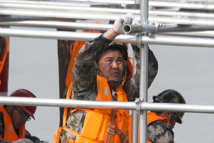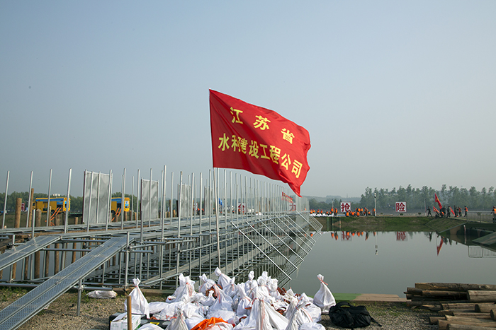 “是!江苏水建防汛抢险突击队立即开展钢木土石组合坝搭建作业!”