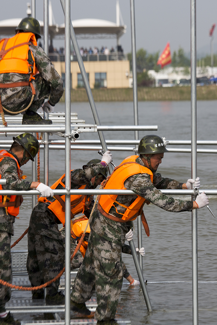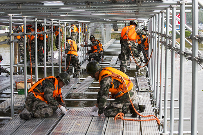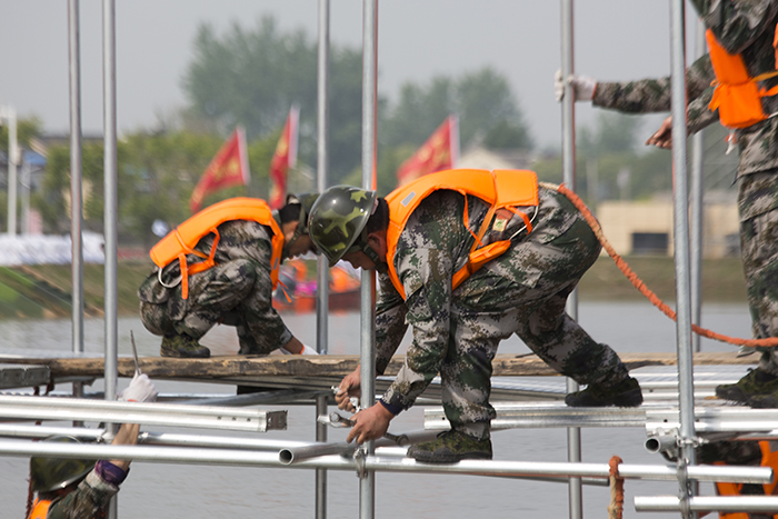 2018427日上午840分,随着江苏省2018军地联合防汛抢险演练指挥部一声令下,世俱杯网页版登录入口参加实战演练的突击队30名架子工立即奔赴现场,迅速进行脚手架搭建作业,参加钢木土石组合坝封堵决口演练。